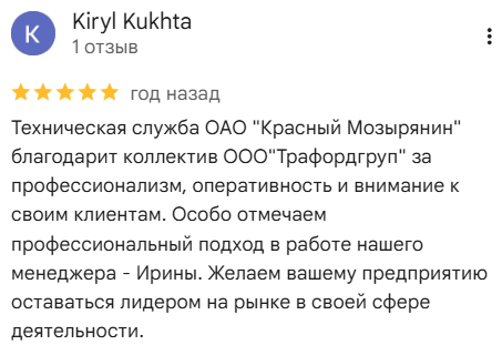 Техническая служба ОАО "Красный Мозырянин" благодарит коллектив ООО"Трафордгруп" за профессионализм, оперативность и внимание к своим клиентам. Особо отмечаем профессиональный подход в работе нашего менеджера - Ирины. Желаем вашему предприятию оставаться лидером на рынке в своей сфере деятельности.