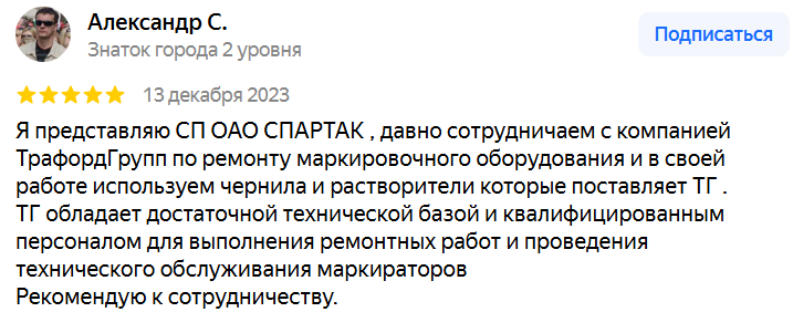 Я представляю СП ОАО СПАРТАК , давно сотрудничаем с компанией ТрафордГрупп по ремонту маркировочного оборудования и в своей работе используем чернила и растворители которые поставляет ТГ .