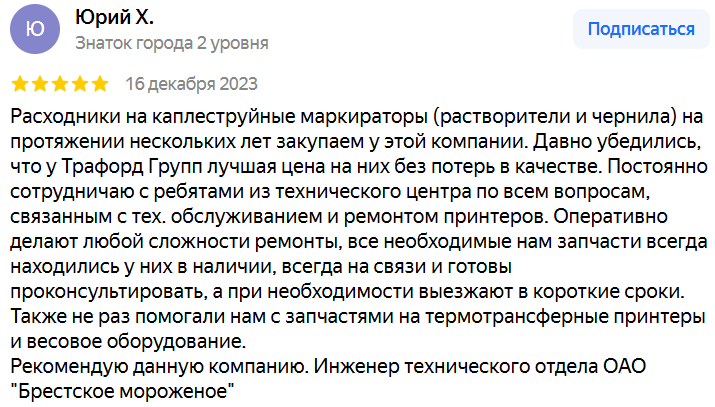 Расходники на каплеструйные маркираторы (растворители и чернила) на протяжении нескольких лет закупаем у этой компании. Давно убедились, что у Трафорд Групп лучшая цена на них без потерь в качестве. Постоянно сотрудничаю с ребятами из технического центра по всем вопросам, связанным с тех. обслуживанием и ремонтом принтеров. Оперативно делают любой сложности ремонты, все необходимые нам запчасти всегда находились у них в наличии, всегда на связи и готовы проконсультировать, а при необходимости выезжают в короткие сроки. Также не раз помогали нам с запчастями на термотрансферные принтеры и весовое оборудование.