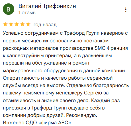 Успешно сотрудничаем с Трафорд Групп наверное с первых месяцев их основания по поставкам расходных материалов производства SMC Франция к каплеструйным принтерам, а в дальнейшем перешли на обслуживание и ремонт маркировочного оборудования в данной компании. Оперативность и качество работы сервисной службы всегда на высоте. Отдельная благодарность нашему неизменному менеджеру Сергею за отзывчивость и знание своего дела. Каждый раз приезжая в Трафорд Групп ощущаю себя в компании добрых друзей. Рекомендую.