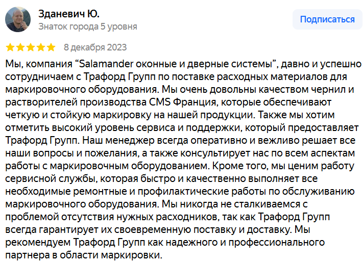 Мы, компания “Salamander оконные и дверные системы”, давно и успешно сотрудничаем с Трафорд Групп по поставке расходных материалов для маркировочного оборудования. Мы очень довольны качеством чернил и растворителей производства CMS Франция, которые обеспечивают четкую и стойкую маркировку на нашей продукции. Также мы хотим отметить высокий уровень сервиса и поддержки, который предоставляет Трафорд Групп. Наш менеджер всегда оперативно и вежливо решает все наши вопросы и пожелания, а также консультирует нас по всем аспектам работы с маркировочным оборудованием. Кроме того, мы ценим работу сервисной службы, которая быстро и качественно выполняет все необходимые ремонтные и профилактические работы по обслуживанию маркировочного оборудования. Мы никогда не сталкиваемся с проблемой отсутствия нужных расходников, так как Трафорд Групп всегда гарантирует их своевременную поставку и доставку. Мы рекомендуем Трафорд Групп как надежного и профессионального партнера в области маркировки.