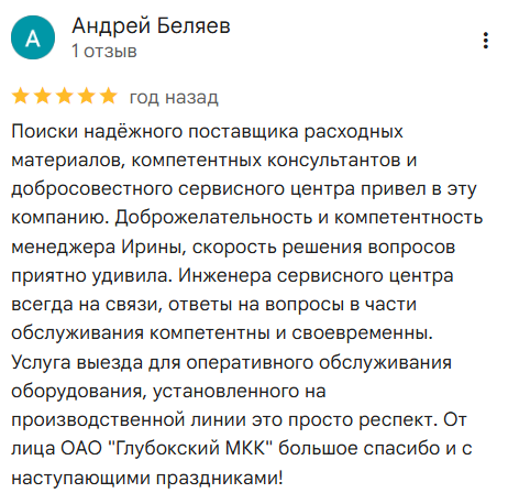 Поиски надёжного поставщика расходных материалов, компетентных консультантов и добросовестного сервисного центра привел в эту компанию. Доброжелательность и компетентность менеджера Ирины, скорость решения вопросов приятно удивила. Инженера сервисного центра всегда на связи, ответы на вопросы в части обслуживания компетентны и своевременны. Услуга выезда для оперативного обслуживания оборудования, установленного на производственной линии это просто респект. От лица ОАО "Глубокский МКК" большое спасибо и с наступающими праздниками!