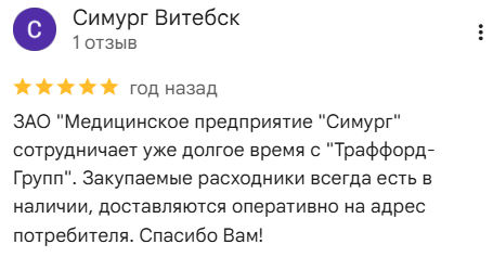 ЗАО "Медицинское предприятие "Симург" сотрудничает уже долгое время с "Траффорд-Групп". Закупаемые расходники всегда есть в наличии, доставляются оперативно на адрес потребителя. Спасибо Вам!